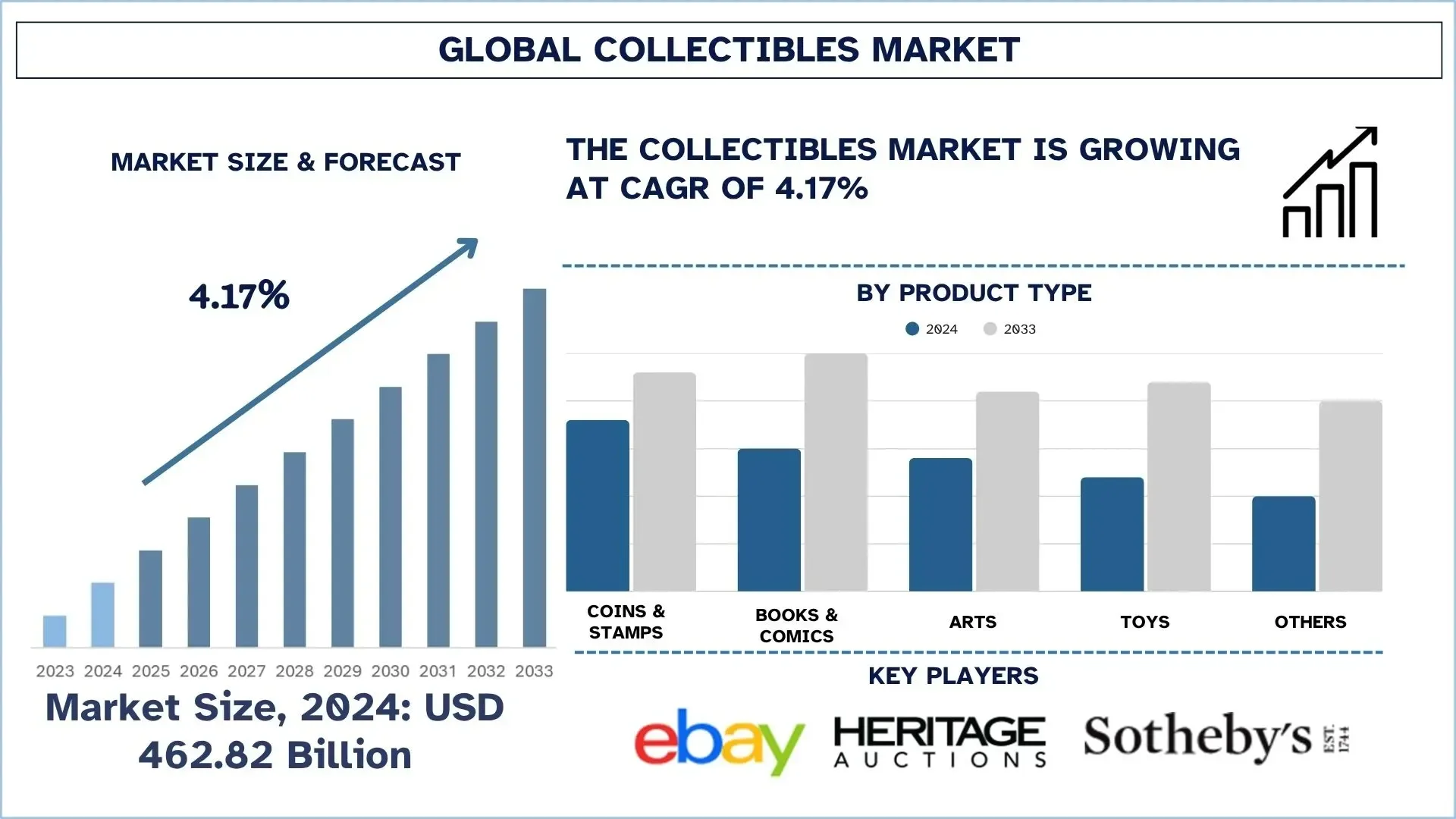 According to the UnivDatos, growing consumer interest in nostalgia and pop culture, increased disposable income among millennials and Gen Z, and the rise of digital platforms and marketplaces that simplify trading and authentication are the major factors driving the growth of the Collectibles market worldwide. As per their “Collectibles Market” report, the global market was valued at USD ~462.82 billion in 2024, growing at a CAGR of about 4.17% during the forecast period from 2025 - 2033 to reach USD billion by 2033.