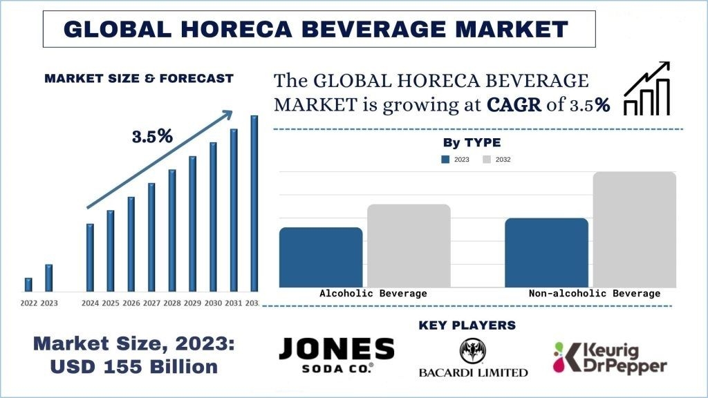 According to the UnivDatos analysis, the surge in product launches and the rise in tourism will drive the global scenario of the HORECA beverage market. As per their “HORECA Beverage Market” report, the global market was valued at USD 155 Billion in 2023, growing at a CAGR of about 3.5% during the forecast period from 2024 - 2032 to reach USD billion by 2032.