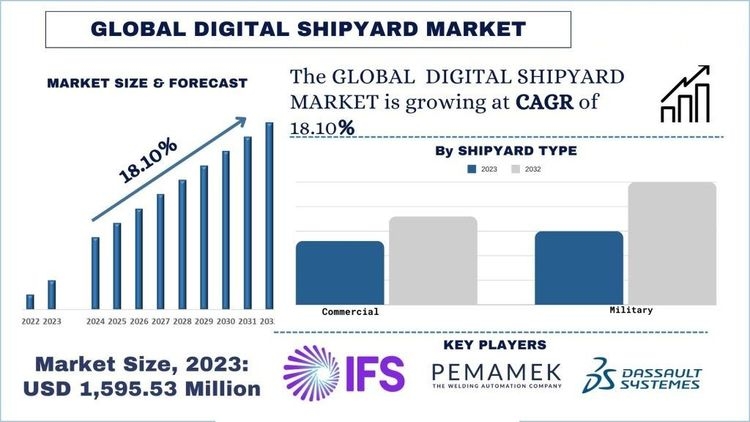 Military shipyards have been at the forefront of adopting cutting-edge digital technologies, such as 3D modeling, simulation, and automation, to streamline their shipbuilding and repair processes. The need for enhanced efficiency, precision, and security in military vessel production has been a key factor driving the digital transformation of these shipyards. Furthermore, military vessels are subject to rigorous quality and safety standards, necessitating advanced digital tools and processes. Digital shipyard technologies enable military shipyards to maintain strict quality control, conduct virtual testing, and ensure the overall integrity of their vessels. Additionally, the construction of highly specialized and technologically advanced military vessels, such as aircraft carriers, submarines, and advanced surface ships, has driven the demand for digital shipyard solutions. These complex vessels require precise planning, coordination, and execution, which can be better managed through the use of digital technologies. Lastly, the integration of Industrial Internet of Things (IIoT) and Artificial Intelligence (AI) technologies has improved operational efficiency, reduced downtime, and enhanced predictive maintenance in commercial shipyards. These technologies are critical for the development of military shipyards. These advances, among others, have contributed immensely to the adoption of digital shipyards within military shipyards.