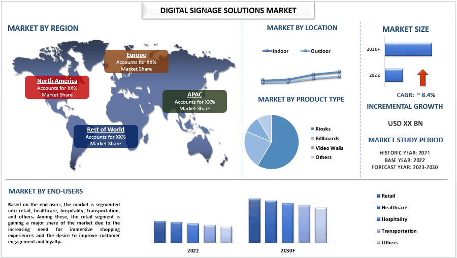 According to the UnivDatos analysis, “Digital Signage Solutions Market” report, the global market was valued at USD 24.9 Billion in 2022, growing at a CAGR of 8.4% during the forecast period from 2023 - 2030 to reach USD billion by 2030.