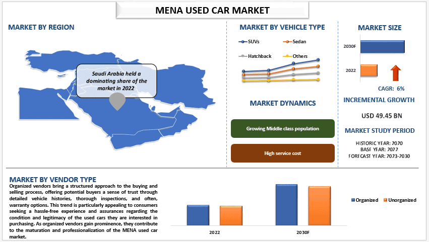 According to the UnivDatos analysis, the rising middle-class population will drive the global scenario of used cars and as per their “MENA Used Cars Market” report, the global market was valued at USD 49.45 Billion in 2022, growing at a CAGR of 6% during the forecast period from 2023 - 2030 to reach USD billion by 2030.