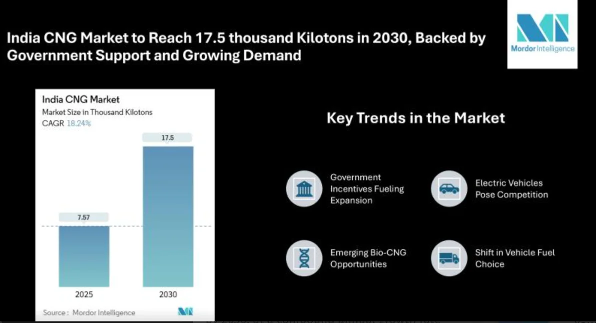 India's compressed natural gas (CNG) sector is slated for sustained growth over the coming years. According to Mordor Intelligence, the CNG market is estimated at 7.57 thousand kilotons in 2025 and is projected to climb to 17.5 thousand kilotons by 2030, at a compound annual growth rate (CAGR) of 18.24% from 2025 to 2030. This rise reflects growing acceptance of CNG as a cleaner, more economical fuel, shaped by policy incentives and rising vehicle adoption.