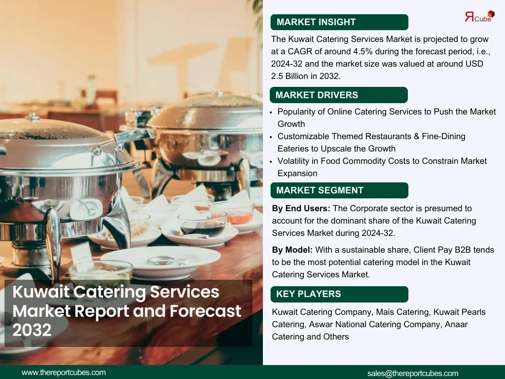 The Report Cube which is one of the leading market research company in UAE expects the Kuwait Catering Services Market to grow at a CAGR of around 4.5% through 2032, as highlighted in their latest research report. The study provides an in-depth analysis of the emerging trends shaping the Kuwait Catering Services Market and offers detailed forecasts for its potential growth during 2025–2032. The report also presents a comprehensive assessment of the competitive landscape, including profiles of leading players, their performance metrics, and recent strategic developments. Additionally, it explores the key market drivers, challenges, opportunities, and provides insights into historical and future revenue trends at the global, regional, and country levels.