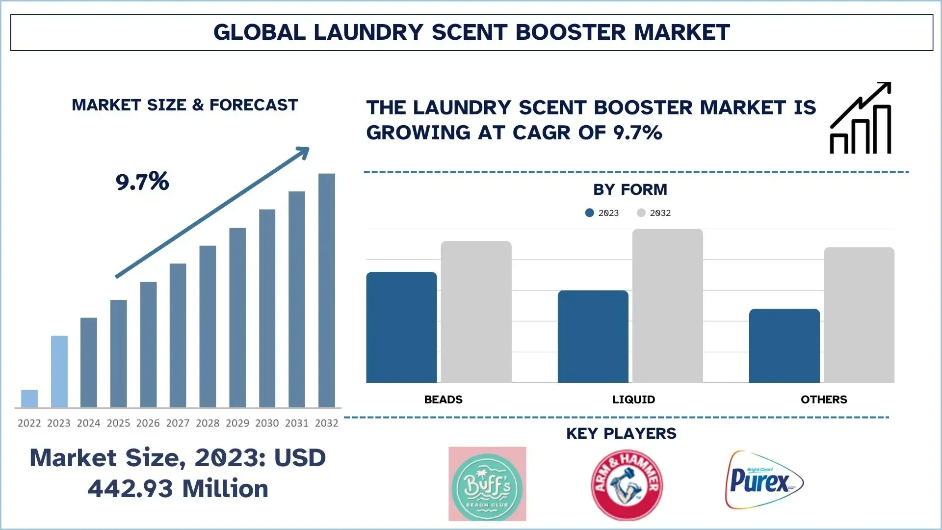 According to the UnivDatos analysis, increased awareness about fabric care and hygiene, growing demand for premium, eco-friendly, and sustainable laundry products are the major factors driving the growth of the Laundry Scent Booster market worldwide. As per their “Laundry Scent Booster Market” report, the global market was valued at USD 442.93 million in 2023, growing at a CAGR of about 9.7% during the forecast period from 2024 - 2032 to reach USD million by 2032.