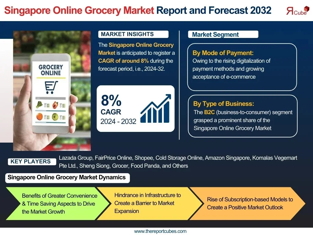 The Report Cube which is one of the leading market research company in UAE expects the Singapore Online Grocery Market to grow at a CAGR of around 8% through 2032, as highlighted in their latest research report. The study provides an in-depth analysis of the emerging trends shaping the Singapore Online Grocery Market and offers detailed forecasts for its potential growth during 2023–2032. The report also presents a comprehensive assessment of the competitive landscape, including profiles of leading players, their performance metrics, and recent strategic developments. Additionally, it explores the key market drivers, challenges, opportunities, and provides insights into historical and future revenue trends at the global, regional, and country levels.