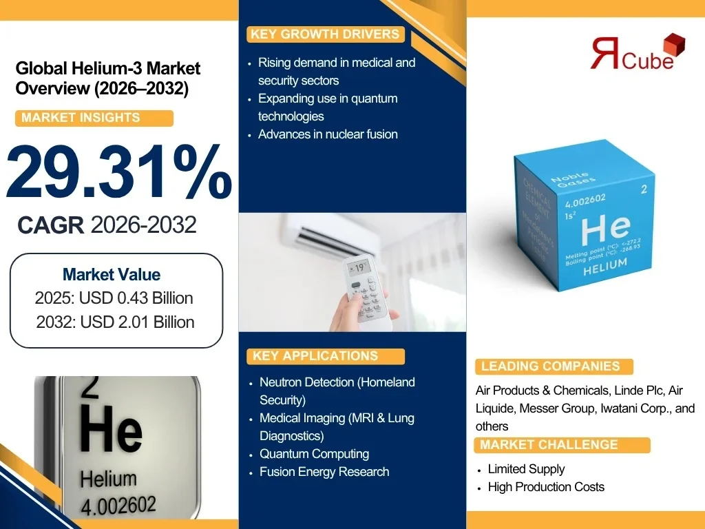 The Report Cube which is one of the leading market research company in UAE expects the Helium-3 Market to grow at a CAGR of around 29.31% through 2032, as highlighted in their latest research report. The study provides an in-depth analysis of the emerging trends shaping the Helium-3 Market and offers detailed forecasts for its potential growth during 2025–2032. The report also presents a comprehensive assessment of the competitive landscape, including profiles of leading players, their performance metrics, and recent strategic developments. Additionally, it explores the key market drivers, challenges, opportunities, and provides insights into historical and future revenue trends at the global, regional, and country levels.