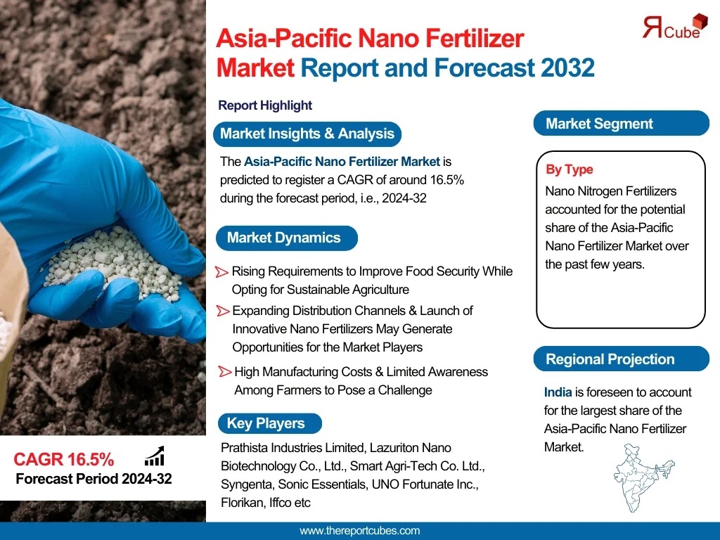 The Report Cube which is one of the leading market research company in UAE expects the Asia-Pacific Nano Fertilizer Market to grow at a CAGR of around 16.5% through 2032, as highlighted in their latest research report. The study provides an in-depth analysis of the emerging trends shaping the Asia-Pacific Nano Fertilizer Market and offers detailed forecasts for its potential growth during 2023–2032. The report also presents a comprehensive assessment of the competitive landscape, including profiles of leading players, their performance metrics, and recent strategic developments. Additionally, it explores the key market drivers, challenges, opportunities, and provides insights into historical and future revenue trends at the global, regional, and country levels.