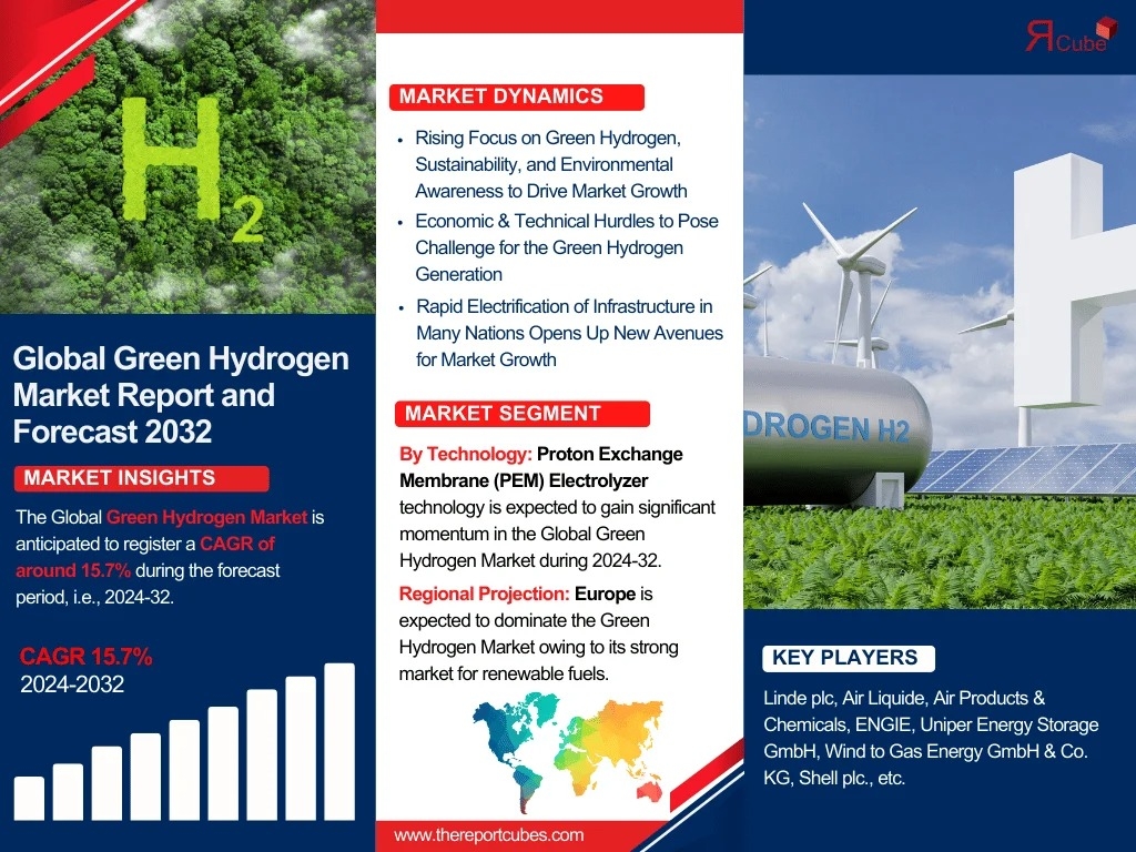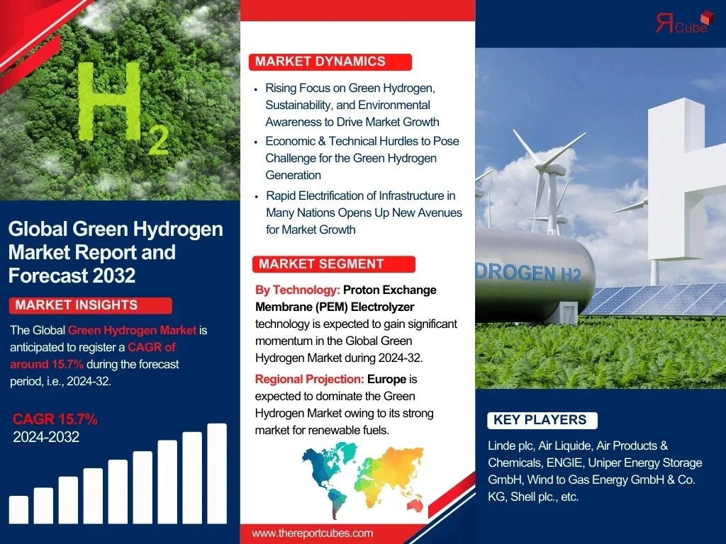 The Report Cube which is one of the leading market research company in UAE expects the Green Hydrogen Market to grow at a CAGR of around 15.7% through 2032, as highlighted in their latest research report. The study provides an in-depth analysis of the emerging trends shaping the Green Hydrogen Market and offers detailed forecasts for its potential growth during 2023–2032. The report also presents a comprehensive assessment of the competitive landscape, including profiles of leading players, their performance metrics, and recent strategic developments. Additionally, it explores the key market drivers, challenges, opportunities, and provides insights into historical and future revenue trends at the global, regional, and country levels.