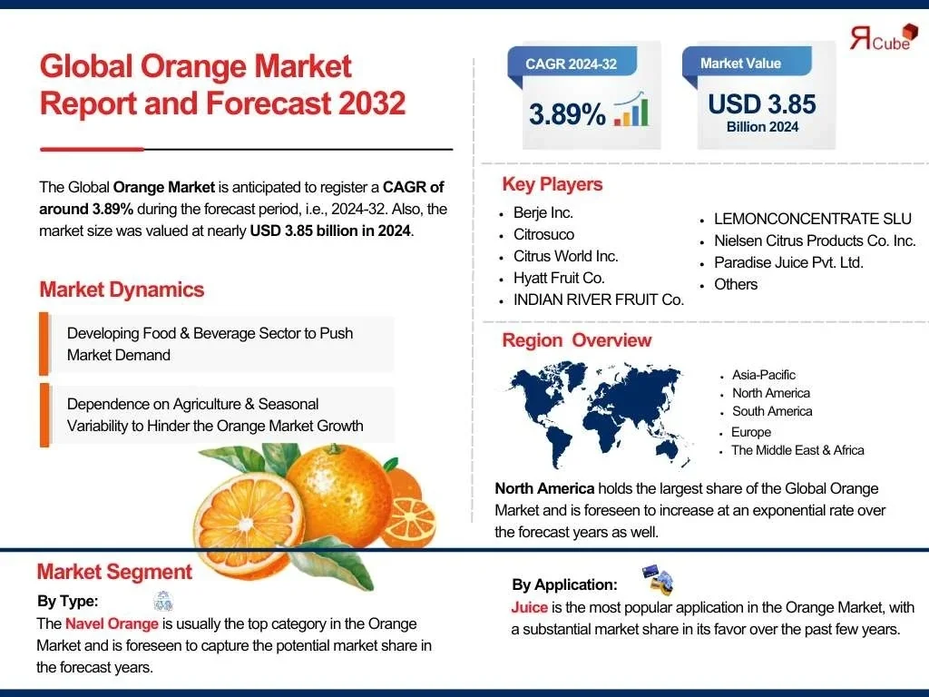 The Report Cube which is one of the leading market research company in UAE expects the Orange Market to grow at a CAGR of around 3.89% through 2032, as highlighted in their latest research report. The study provides an in-depth analysis of the emerging trends shaping the Orange Market and offers detailed forecasts for its potential growth during 2024–2032. The report also presents a comprehensive assessment of the competitive landscape, including profiles of leading players, their performance metrics, and recent strategic developments. Additionally, it explores the key market drivers, challenges, opportunities, and provides insights into historical and future revenue trends at the global, regional, and country levels.