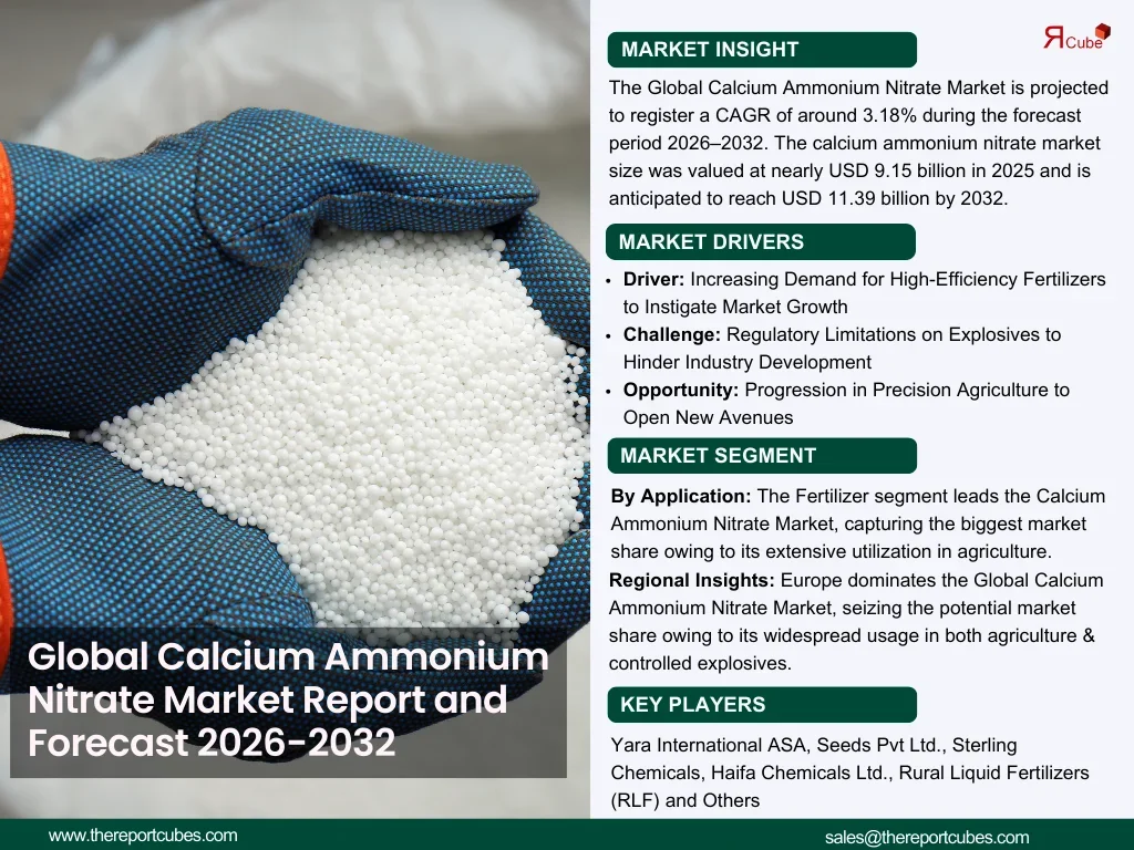 The Report Cube which is one of the leading market research company in UAE expects the Global Calcium Ammonium Nitrate Market to grow at a CAGR of around 3.18% through 2032, as highlighted in their latest research report. The study provides an in-depth analysis of the emerging trends shaping the Global Calcium Ammonium Nitrate Market and offers detailed forecasts for its potential growth during 2025–2032. The report also presents a comprehensive assessment of the competitive landscape, including profiles of leading players, their performance metrics, and recent strategic developments. Additionally, it explores the key market drivers, challenges, opportunities, and provides insights into historical and future revenue trends at the global, regional, and country levels.
