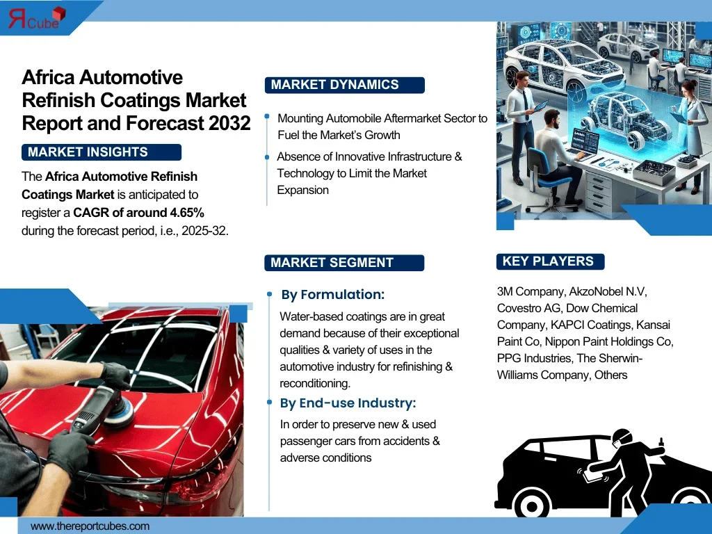 The Report Cube which is one of the leading market research company in UAE expects the Africa Automotive Refinish Coatings Market to grow at a CAGR of around 4.65% through 2032, as highlighted in their latest research report. The study provides an in-depth analysis of the emerging trends shaping the Africa Automotive Refinish Coatings Market and offers detailed forecasts for its potential growth during 2025–2032. The report also presents a comprehensive assessment of the competitive landscape, including profiles of leading players, their performance metrics, and recent strategic developments. Additionally, it explores the key market drivers, challenges, opportunities, and provides insights into historical and future revenue trends at the global, regional, and country levels.