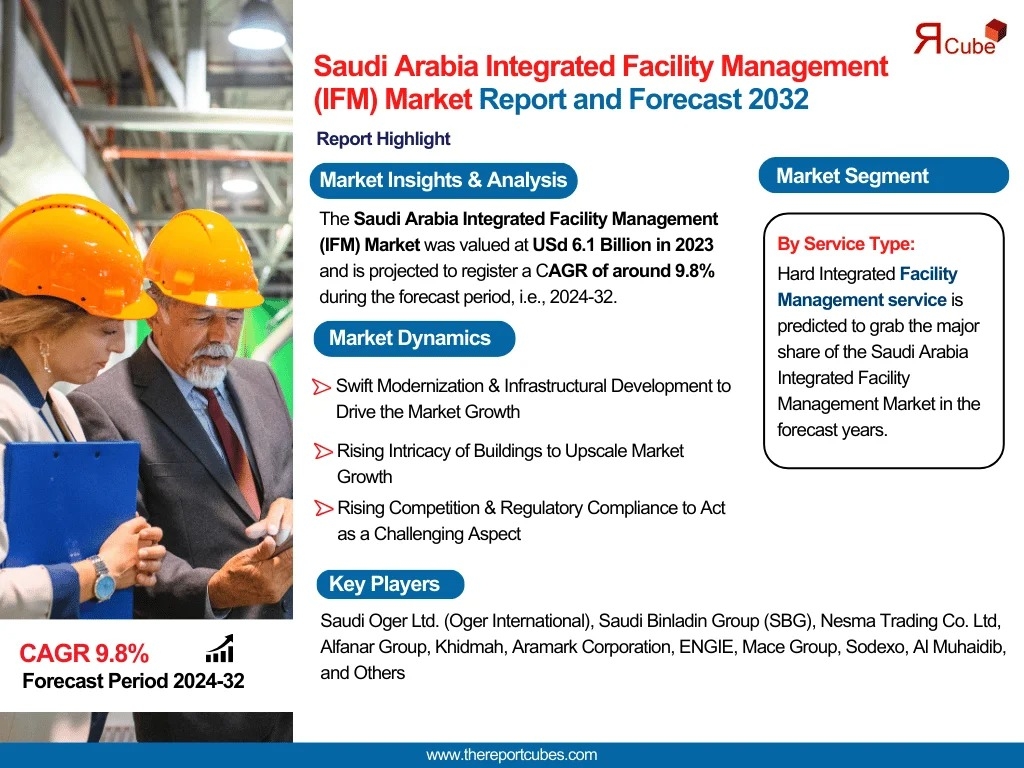 The Report Cube which is one of the leading market research company in UAE expects the Saudi Arabia Integrated Facility Management (IFM) Market to grow at a CAGR of around 9.8% through 2032, as highlighted in their latest research report. The study provides an in-depth analysis of the emerging trends shaping the Saudi Arabia Integrated Facility Management (IFM) Market and offers detailed forecasts for its potential growth during 2023–2032. The report also presents a comprehensive assessment of the competitive landscape, including profiles of leading players, their performance metrics, and recent strategic developments. Additionally, it explores the key market drivers, challenges, opportunities, and provides insights into historical and future revenue trends at the global, regional, and country levels.