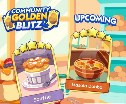 The designated gold stickers for Monopoly Go Golden Blitz event will go on sale on IGGM on October 9th, called "Set17 - Masala Dabba and Set14 - Soufflé".