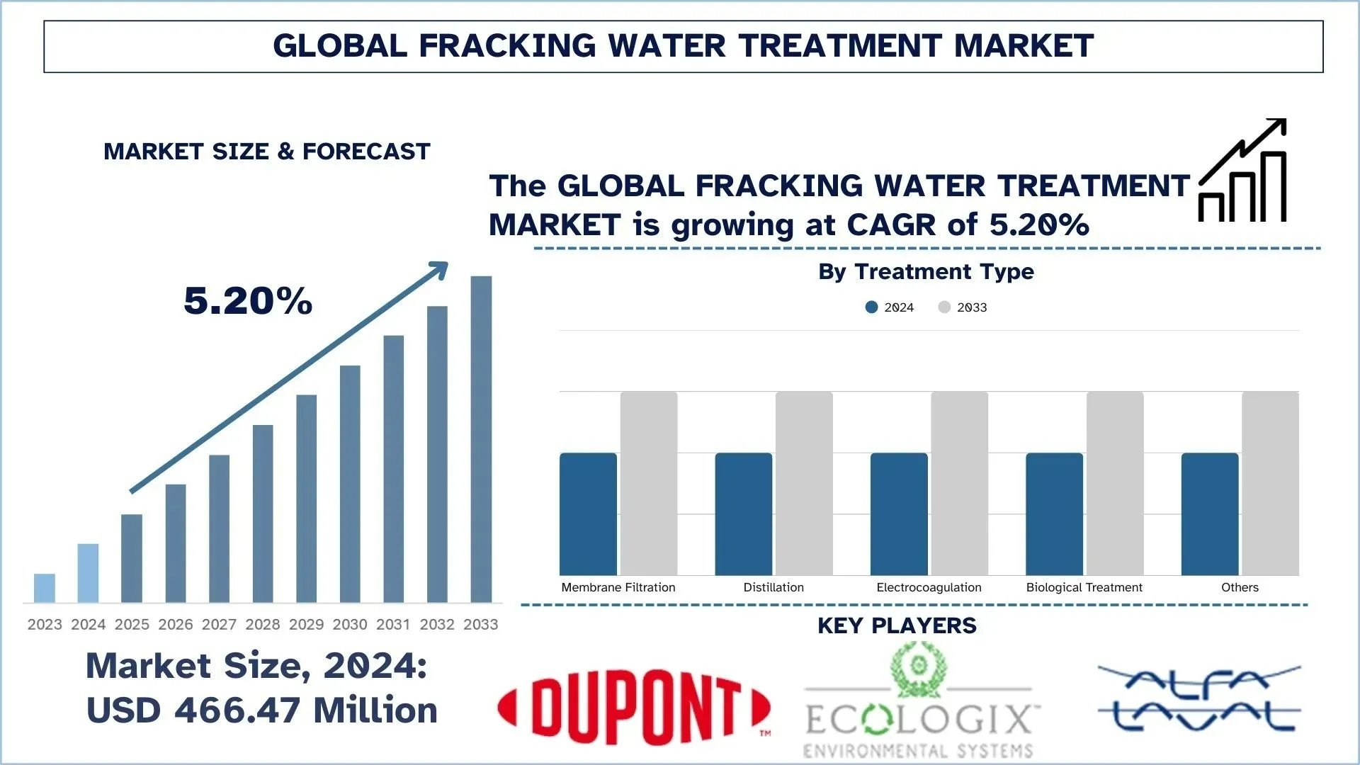According to UnivDatos, as per their “Fracking Water Treatment Market” report, the global market was valued at USD 466.47 million in 2024, growing at a CAGR of approximately 5.20% during the forecast period from 2025 to 2033, to reach USD million by 2033.
