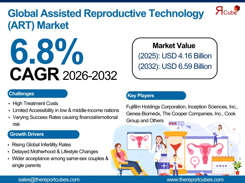 The Report Cube which is one of the leading market research company in UAE expects the Global Assisted Reproductive Technology Market to grow at a CAGR of around 6.8% through 2032, as highlighted in their latest research report. The study provides an in-depth analysis of the emerging trends shaping the Global Assisted Reproductive Technology Market and offers detailed forecasts for its potential growth during 2025–2032. The report also presents a comprehensive assessment of the competitive landscape, including profiles of leading players, their performance metrics, and recent strategic developments. Additionally, it explores the key market drivers, challenges, opportunities, and provides insights into historical and future revenue trends at the global, regional, and country levels.