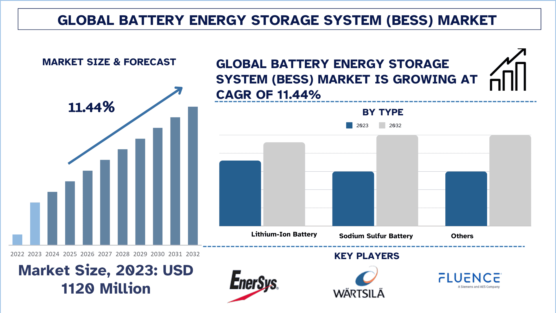According to the Univdatos analysis, growing demand for power delivering systems and its safety features will drive the growth scenario of Battery Energy Storage System (BESS) and as per their “Battery Energy Storage System (BESS) Market” report, the global market was valued at USD 1120 million in 2023, growing at a CAGR of 11.44% during the forecast period from 2024 - 2032 to reach USD million by 2032.
