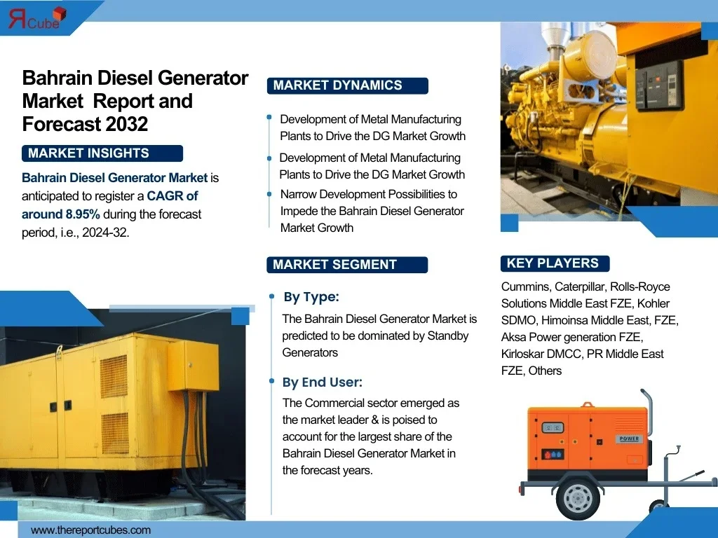 The Report Cube which is one of the leading market research company in UAE expects the Bahrain Diesel Generator Market to grow at a CAGR of around 8.95% through 2032, as highlighted in their latest research report. The study provides an in-depth analysis of the emerging trends shaping the Bahrain Diesel Generator Market and offers detailed forecasts for its potential growth during 2023–2032. The report also presents a comprehensive assessment of the competitive landscape, including profiles of leading players, their performance metrics, and recent strategic developments. Additionally, it explores the key market drivers, challenges, opportunities, and provides insights into historical and future revenue trends at the global, regional, and country levels.