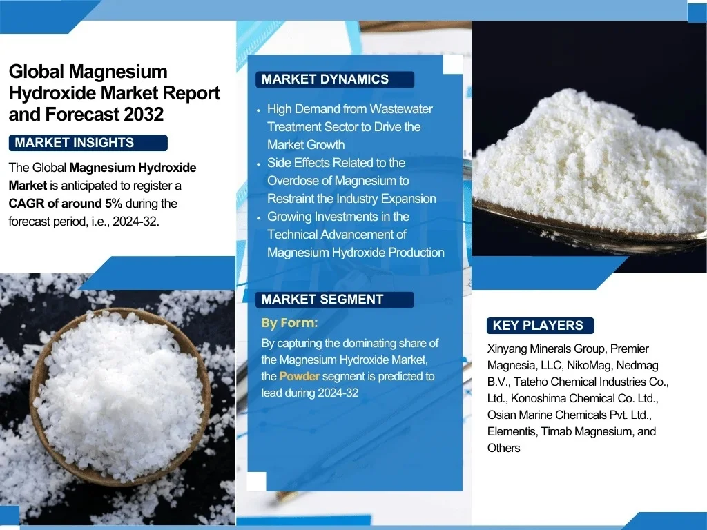 The Report Cube which is one of the leading market research company in UAE expects the Magnesium Hydroxide Market to grow at a CAGR of around 5% through 2032, as highlighted in their latest research report. The study provides an in-depth analysis of the emerging trends shaping the Magnesium Hydroxide Market and offers detailed forecasts for its potential growth during 2024–2032. The report also presents a comprehensive assessment of the competitive landscape, including profiles of leading players, their performance metrics, and recent strategic developments. Additionally, it explores the key market drivers, challenges, opportunities, and provides insights into historical and future revenue trends at the global, regional, and country levels.