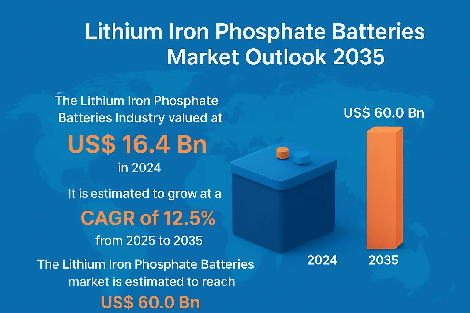 Valued at US$ 16.4 billion in 2024, the global LFP batteries market is projected to grow at an impressive CAGR of 12.5% between 2025 and 2035, reaching nearly US$ 60.0 billion by 2035. This exponential rise reflects how LFP batteries are becoming indispensable in electric vehicles (EVs), grid energy storage, industrial automation, and residential power solutions.