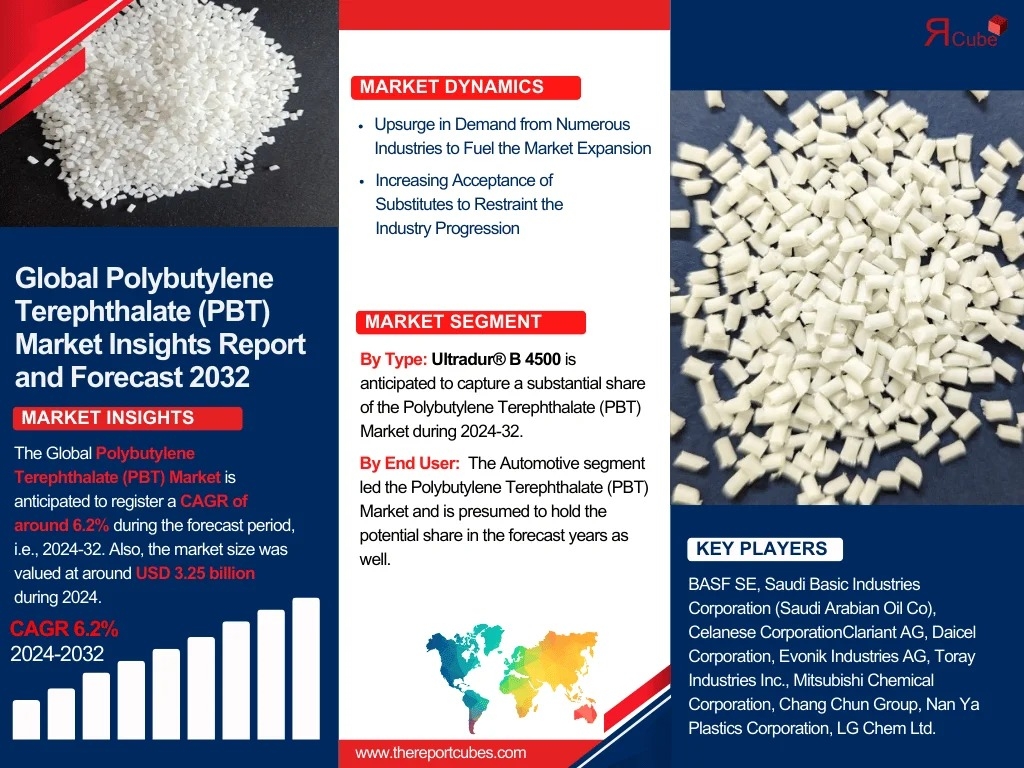 The Report Cube which is one of the leading market research company in UAE expects the Polybutylene Terephthalate (PBT) Market to grow at a CAGR of around 9.5% through 2032, as highlighted in their latest research report. The study provides an in-depth analysis of the emerging trends shaping the Polybutylene Terephthalate (PBT) Market and offers detailed forecasts for its potential growth during 2024–2032. The report also presents a comprehensive assessment of the competitive landscape, including profiles of leading players, their performance metrics, and recent strategic developments. Additionally, it explores the key market drivers, challenges, opportunities, and provides insights into historical and future revenue trends at the global, regional, and country levels.