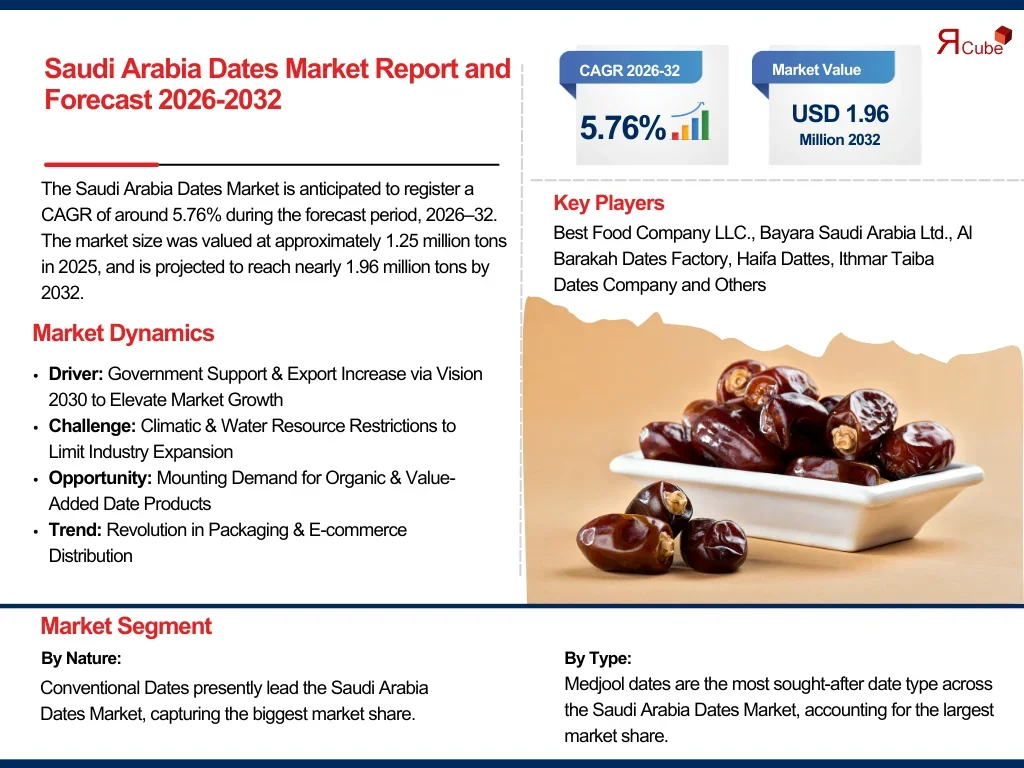 The Report Cube which is one of the leading market research company in UAE expects the Saudi Arabia Dates Market to grow at a CAGR of around 5.76% through 2032, as highlighted in their latest research report. The study provides an in-depth analysis of the emerging trends shaping the Saudi Arabia Dates Market and offers detailed forecasts for its potential growth during 2024–2032. The report also presents a comprehensive assessment of the competitive landscape, including profiles of leading players, their performance metrics, and recent strategic developments. Additionally, it explores the key market drivers, challenges, opportunities, and provides insights into historical and future revenue trends at the global, regional, and country levels.