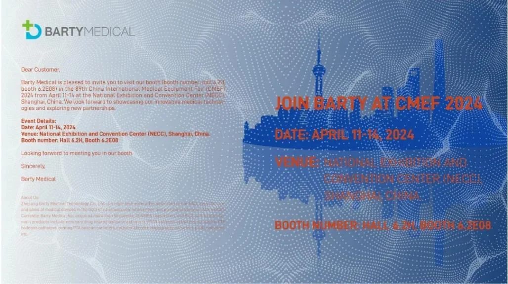 Zhejiang Barty Medical Technology Co., Ltd. ("Barty Medical"), a leading national high-tech enterprise in the field of vascular intervention, is excited to announce its participation in the 89th China International Medical Equipment Fair (CMEF) 2024. The event is set to take place from April 11-14 at the National Exhibition and Convention Center (NECC) in Shanghai, China.