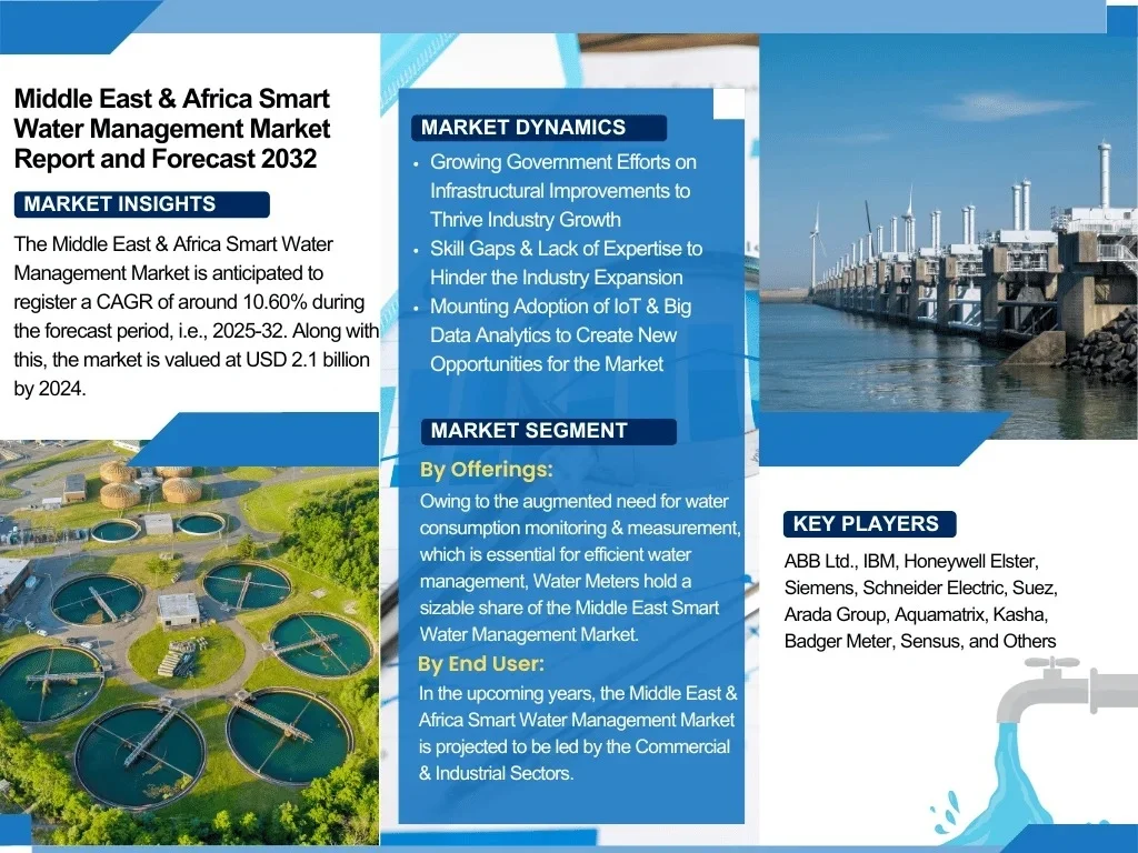 The Report Cube which is one of the leading market research company in UAE expects the Middle East & Africa Smart Water Management Market to grow at a CAGR of around 10.60% through 2032, as highlighted in their latest research report. The study provides an in-depth analysis of the emerging trends shaping the Middle East & Africa Smart Water Management Market and offers detailed forecasts for its potential growth during 2025–2032. The report also presents a comprehensive assessment of the competitive landscape, including profiles of leading players, their performance metrics, and recent strategic developments. Additionally, it explores the key market drivers, challenges, opportunities, and provides insights into historical and future revenue trends at the global, regional, and country levels.
