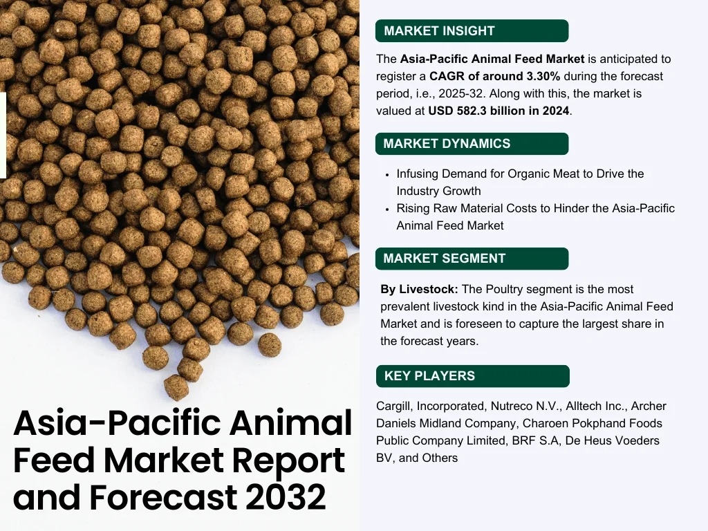 The Report Cube which is one of the leading market research company in UAE expects the Asia-Pacific Animal Feed Market to grow at a CAGR of around 3.30% through 2032, as highlighted in their latest research report. The study provides an in-depth analysis of the emerging trends shaping the Asia-Pacific Animal Feed Market and offers detailed forecasts for its potential growth during 2024–2032. The report also presents a comprehensive assessment of the competitive landscape, including profiles of leading players, their performance metrics, and recent strategic developments. Additionally, it explores the key market drivers, challenges, opportunities, and provides insights into historical and future revenue trends at the global, regional, and country levels.