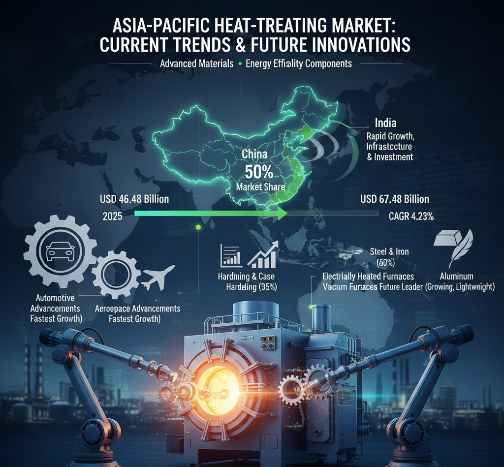 The Asia-Pacific heat-treating market is experiencing significant growth, projected to expand from USD 46.48 billion in 2025 to USD 67.48 billion by 2034, at a CAGR of 4.23%. This growth is driven by advancements in automotive and aerospace sectors, increasing demand for lightweight materials, and the adoption of energy-efficient heat treatment technologies.