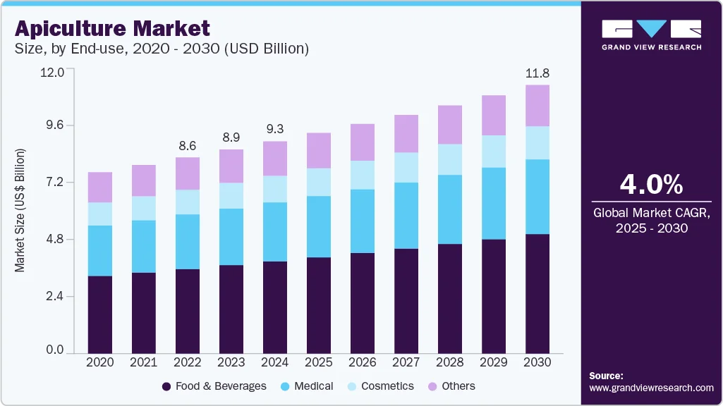 The global apiculture market was valued at USD 9.31 billion in 2024 and is projected to reach USD 11.78 billion by 2030, growing at a compound annual growth rate (CAGR) of 4.0% from 2025 to 2030. This growth is driven by the versatility of bee products, which extend beyond food and beverages into sectors such as pharmaceuticals, cosmetics, and agriculture.