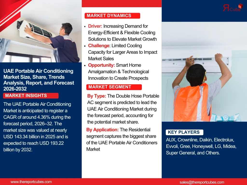 The Report Cube which is one of the leading market research company in UAE expects the UAE Portable Air Conditioning Market to grow at a CAGR of around 4.36% through 2032, as highlighted in their latest research report. The study provides an in-depth analysis of the emerging trends shaping the UAE Portable Air Conditioning Market and offers detailed forecasts for its potential growth during 2025–2032. The report also presents a comprehensive assessment of the competitive landscape, including profiles of leading players, their performance metrics, and recent strategic developments. Additionally, it explores the key market drivers, challenges, opportunities, and provides insights into historical and future revenue trends at the global, regional, and country levels.