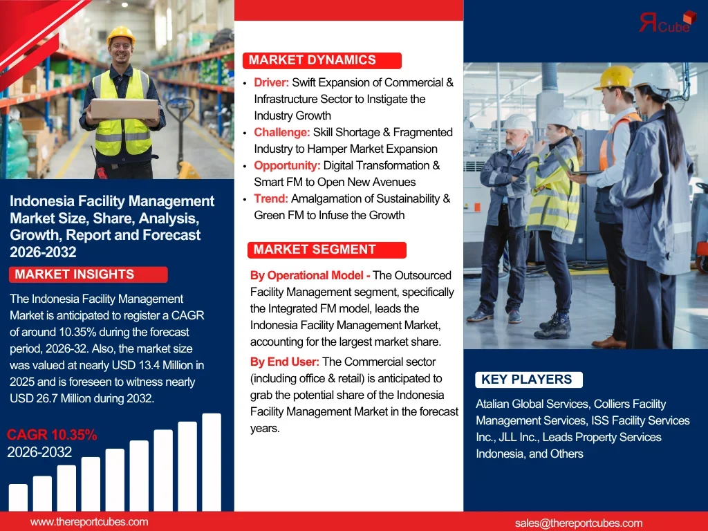 The Report Cube which is one of the leading market research company in UAE expects the Indonesia Facility Management Market to grow at a CAGR of around 10.35% through 2032, as highlighted in their latest research report. The study provides an in-depth analysis of the emerging trends shaping the Indonesia Facility Management Market and offers detailed forecasts for its potential growth during 2026–2032. The report also presents a comprehensive assessment of the competitive landscape, including profiles of leading players, their performance metrics, and recent strategic developments. Additionally, it explores the key market drivers, challenges, opportunities, and provides insights into historical and future revenue trends at the global, regional, and country levels.