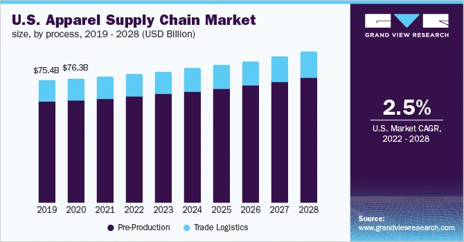 The global apparel supply chain market was valued at USD 863.75 billion in 2021 and is projected to reach USD 1,119.69 billion by 2028, growing at a compound annual growth rate (CAGR) of 3.8% from 2022 to 2028. The increasing demand for apparel from the fashion sector and the expansion of online retail channels are anticipated to drive market growth during the forecast period.