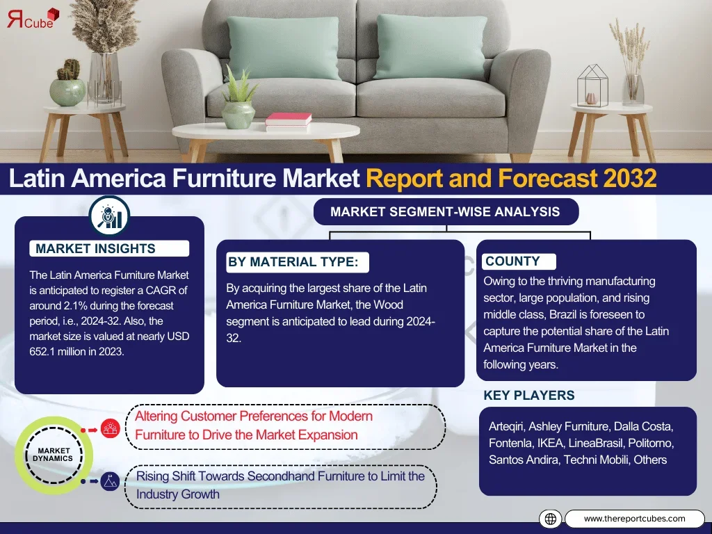 The credible Latin America Furniture Market report covers detailed insights into market size, share, trends, and opportunities. This research helps businesses make informed decisions, strengthen their strategies, and expand their reach in a competitive landscape. The analysis estimates market growth based on evolving dynamics and demand drivers.