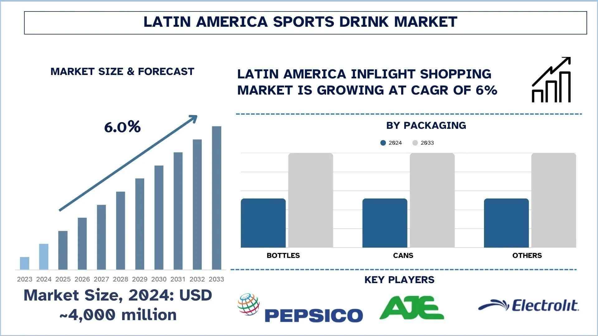 According to UnivDatos, increasing health activities alongside rising consumer disposable income are expected to increase demand for Sports Drinks. As per their “Latin America Sports Drink Market” report, the Latin American market was valued at USD 4,000 million in 2024, growing at a CAGR of about 6% during the forecast period from 2025 - 2033 to reach USD million by 2033.