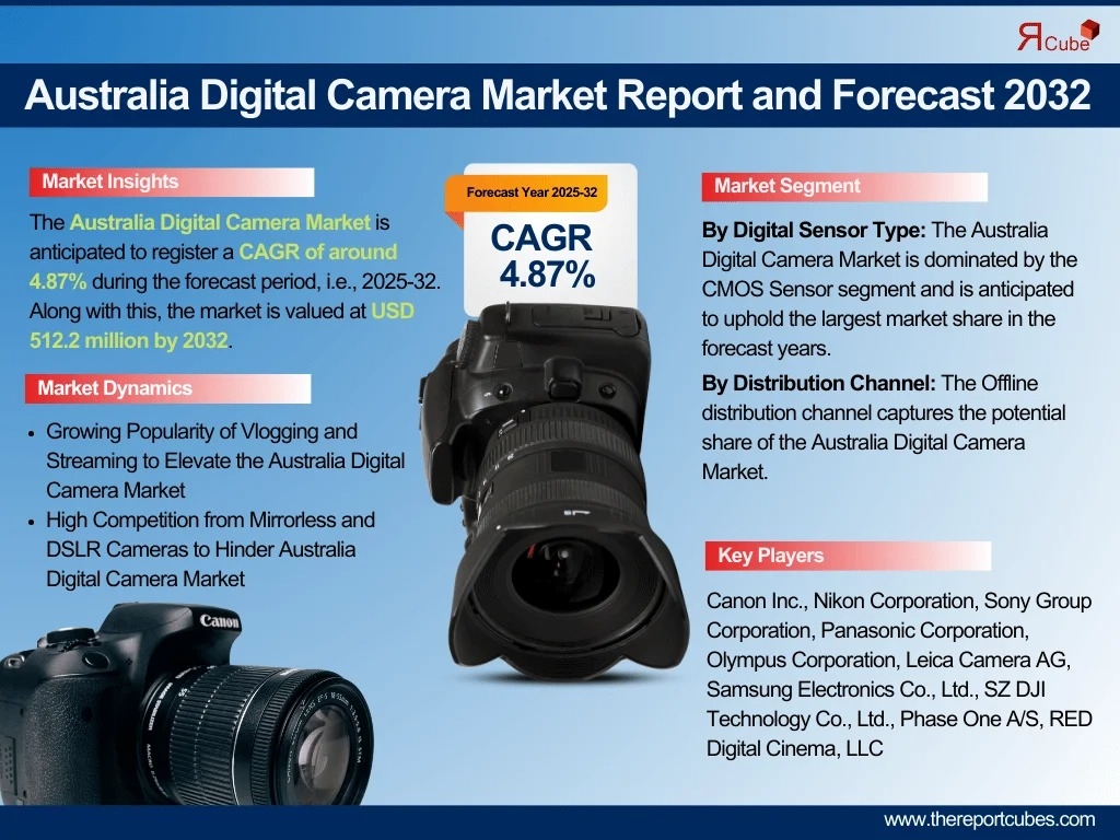 The Report Cube which is one of the leading market research company in UAE expects the Australia Digital Camera Market to grow at a CAGR of around 4.87% through 2032, as highlighted in their latest research report. The study provides an in-depth analysis of the emerging trends shaping the Australia Digital Camera Market and offers detailed forecasts for its potential growth during 2025–2032. The report also presents a comprehensive assessment of the competitive landscape, including profiles of leading players, their performance metrics, and recent strategic developments. Additionally, it explores the key market drivers, challenges, opportunities, and provides insights into historical and future revenue trends at the global, regional, and country levels.