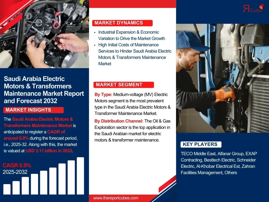 The Report Cube which is one of the leading market research company in UAE expects the Saudi Arabia Electric Motors & Transformers Maintenance Market to grow at a CAGR of around 6.9% through 2032, as highlighted in their latest research report. The study provides an in-depth analysis of the emerging trends shaping the Saudi Arabia Electric Motors & Transformers Maintenance Market and offers detailed forecasts for its potential growth during 2025–2032. The report also presents a comprehensive assessment of the competitive landscape, including profiles of leading players, their performance metrics, and recent strategic developments. Additionally, it explores the key market drivers, challenges, opportunities, and provides insights into historical and future revenue trends at the global, regional, and country levels.