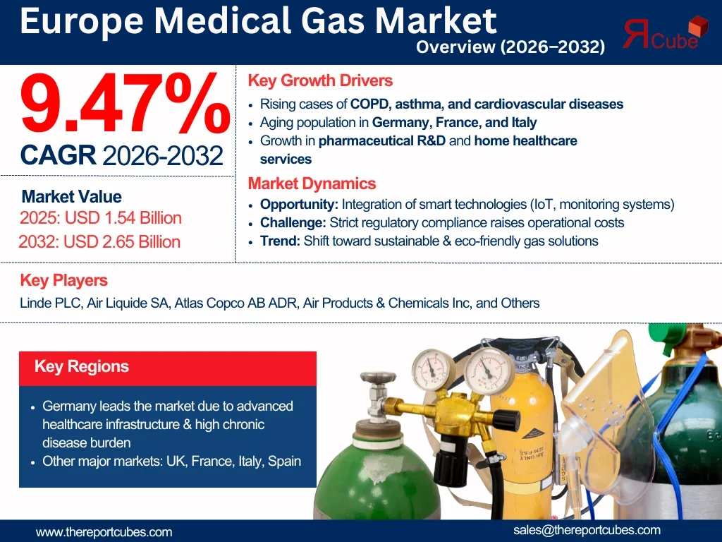 The Europe Medical Gas Market reached a value of nearly USD 1.54 billion in 2025. The market is assessed to grow at a CAGR of around 9.47%, during the forecast period of 2026-2032 to attain a value of around USD 2.65 billion in 2032.