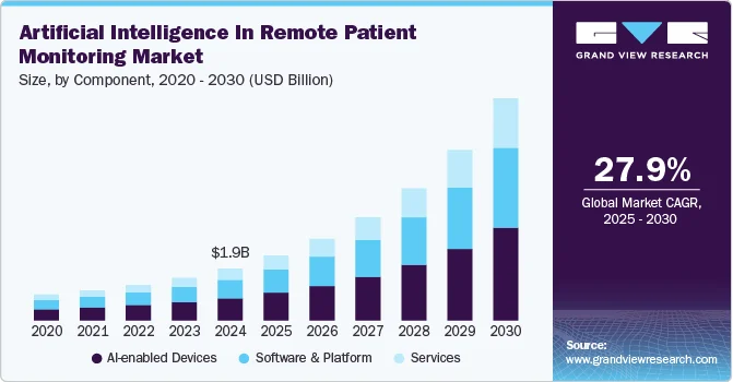 The global market for artificial intelligence in remote patient monitoring was valued at approximately USD 1.99 billion in 2024 and is projected to reach USD 8.51 billion by 2030, representing a compound annual growth rate (CAGR) of 27.98% from 2025 to 2030. Key factors contributing to this market growth include the increasing trend toward personalized healthcare, a heightened focus on cost reduction in healthcare, and ongoing technological advancements.