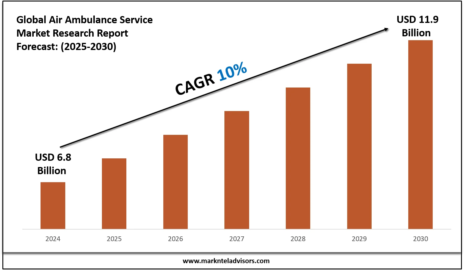The Global Air Ambulance Service Market is poised for substantial growth, estimated to expand from approximately USD 6.8 billion in 2024 to USD 11.9 billion by 2030. This notable increase reflects a compound annual growth rate (CAGR) of around 10% during the forecast period of 2025-2030. The surge in demand for air ambulances is mainly attributed to the growing geriatric population and the rising incidence of chronic illnesses such as cardiovascular diseases, diabetes, and cancer, necessitating prompt medical transportation.