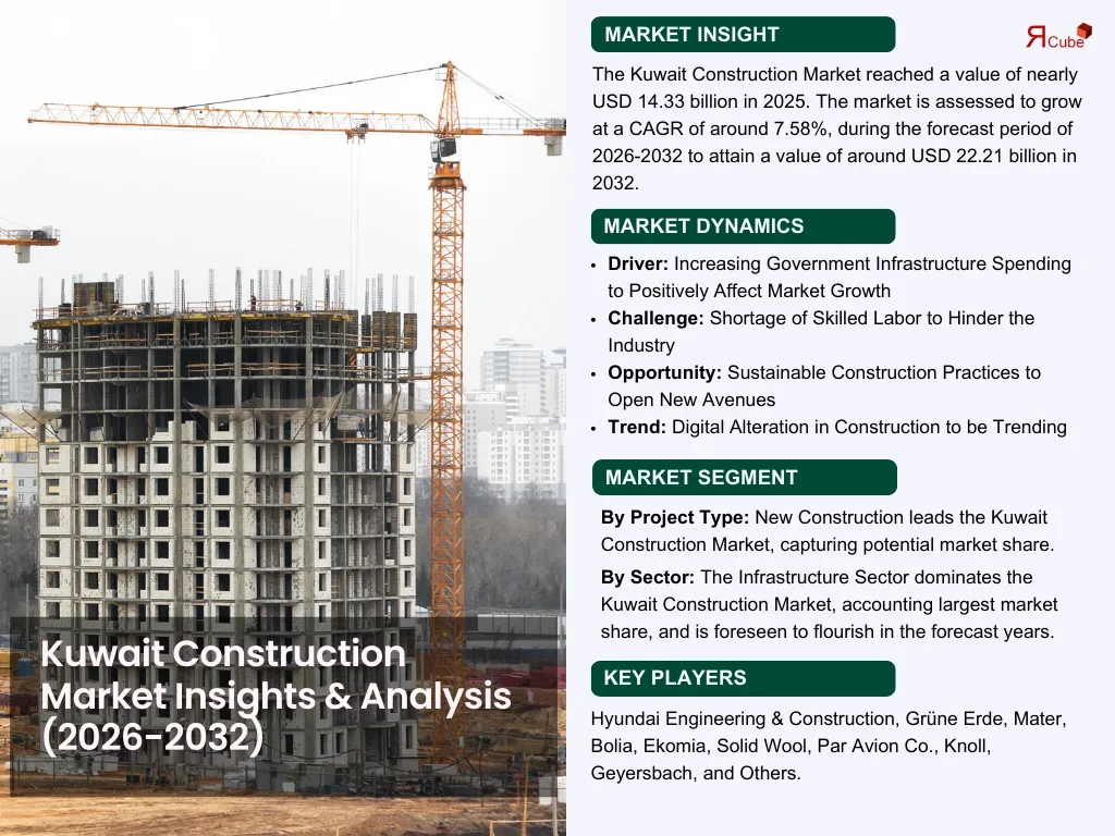 The Report Cube which is one of the leading market research company in UAE expects the Kuwait Construction Market to grow at a CAGR of around 9.13%% through 2032, as highlighted in their latest research report. The study provides an in-depth analysis of the emerging trends shaping the Kuwait Construction Market and offers detailed forecasts for its potential growth during 2026–2032. The report also presents a comprehensive assessment of the competitive landscape, including profiles of leading players, their performance metrics, and recent strategic developments. Additionally, it explores the key market drivers, challenges, opportunities, and provides insights into historical and future revenue trends at the global, regional, and country levels.