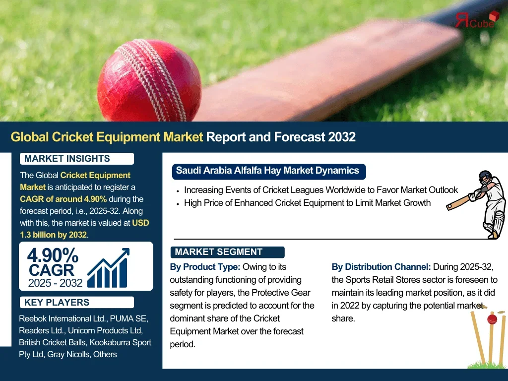 The Global Cricket Equipment Market Size size was valued at USD 0.93 billion in 2025, further projected to be about USD 1.3 billion by 2032, and would register a CAGR of around 4.90% during 2025-32.