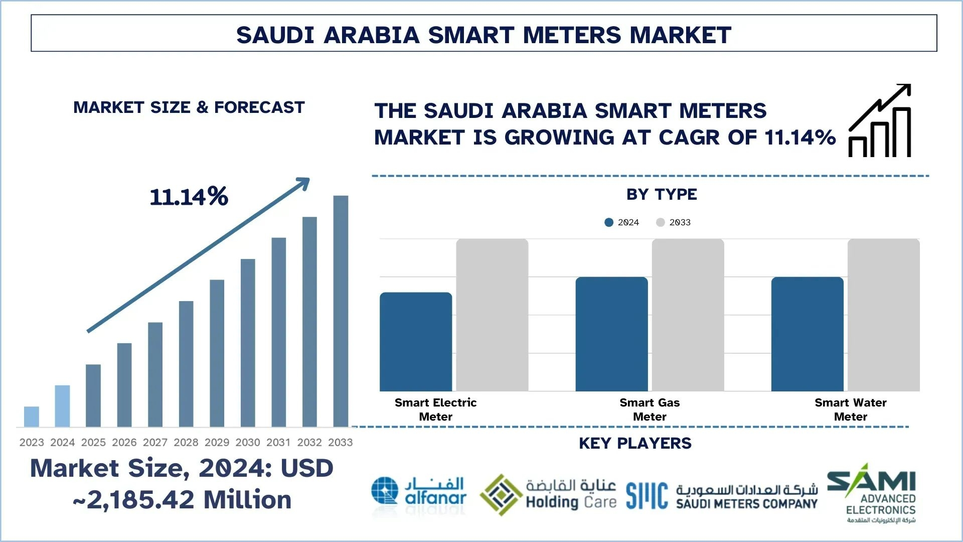 According to UnivDatos, government push under Vision 2030 for digital utilities, large-scale deployment by Saudi Electricity Company, rising demand for real-time energy monitoring, integration of renewables requiring advanced metering, reduction of non-technical losses, increasing IoT and AI adoption for grid management, and expansion of local manufacturing in line with localization goals, drive the Saudi Arabia Smart Meters market. As per their “Saudi Arabia Smart Meters Market” report, the market was valued at USD 2,185.42 Million in 2024, growing at a CAGR of about 11.14% during the forecast period from 2025 - 2033 to reach USD Million by 2033.