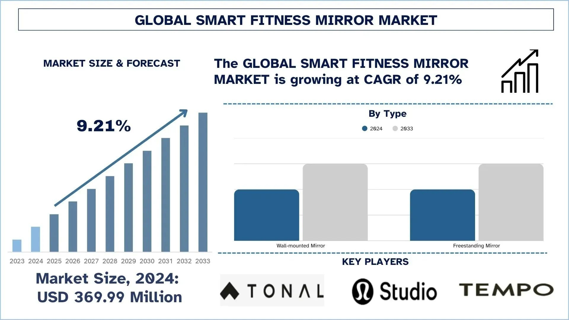 According to the UnivDatos, as per their “Smart Fitness Mirror Market” report, the global market was valued at USD 369.99 million in 2024, growing at a CAGR of about 9.21% during the forecast period from 2025 - 2033 to reach USD million by 2033.
