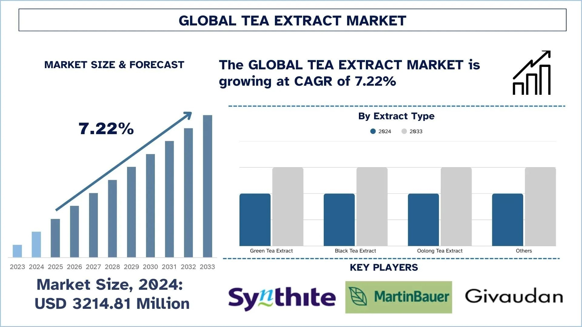 According to UnivDatos analysis, rising global demand for clean-label ingredients, coupled with advanced technologies for extraction, are the major factors driving the growth of the tea extract market. As per their “Tea Extract Market” report, the global market was valued at USD 3,214.81 million in 2024, growing at a CAGR of about 7.22% during the forecast period from 2025 - 2033 to reach USD million by 2033.