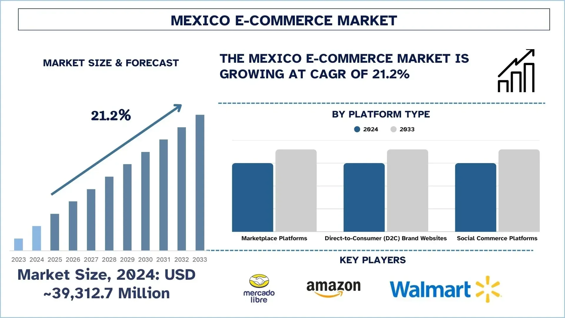 According to the UnivDatos, rising internet and smartphone penetration, combined with improved logistics, would drive the Mexico E-Commerce market. As per their “Mexico E-Commerce Market” report, the market was valued at USD 39,312.7 Million in 2024, growing at a CAGR of about 21.2% during the forecast period from 2025 – 2033.