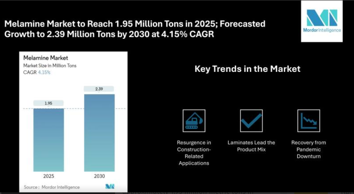 The global melamine market is poised at approximately 1.95 million metric tons in 2025, with expectations to grow steadily to 2.39 million tons by 2030. This steady expansion at a compound annual growth rate of 4.15% reflects recovering industrial activity, particularly in construction and manufacturing sectors.
