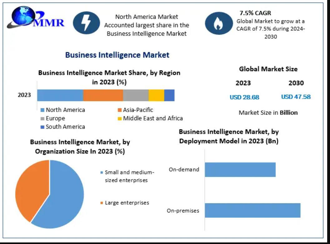 Business Intelligence Market size was valued US$ 28.68 Bn. in 2023 and the total revenue is expected to grow at 7.5% through 2024 to 2030, reaching nearly US$ 47.58 Bn.