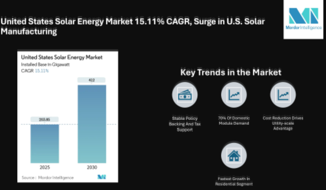 Mordor Intelligence has published a new report on the “United States Solar Energy Market,” offering a comprehensive analysis of Size, Share, Trends, Growth Drivers, and Future Projections.