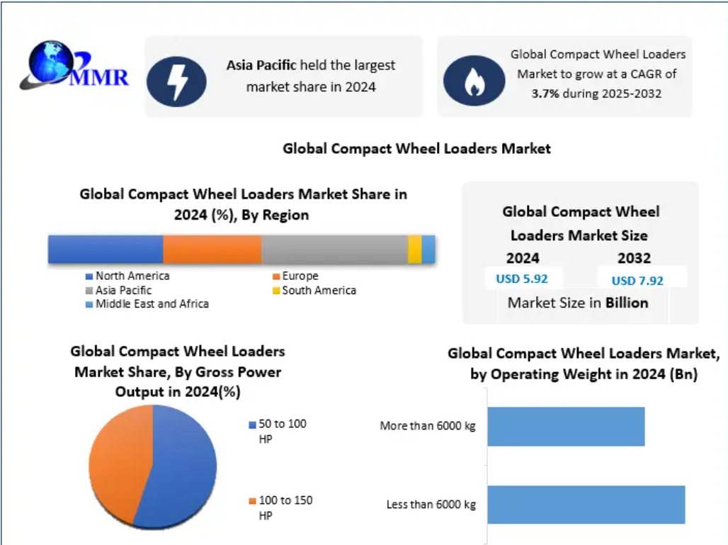 Global Compact Wheel Loaders Market size was valued at USD 5.92 Bn. in 2024 and the total Global Compact Wheel Loaders Market revenue is expected to grow at a CAGR of 3.7% from 2025 to 2032